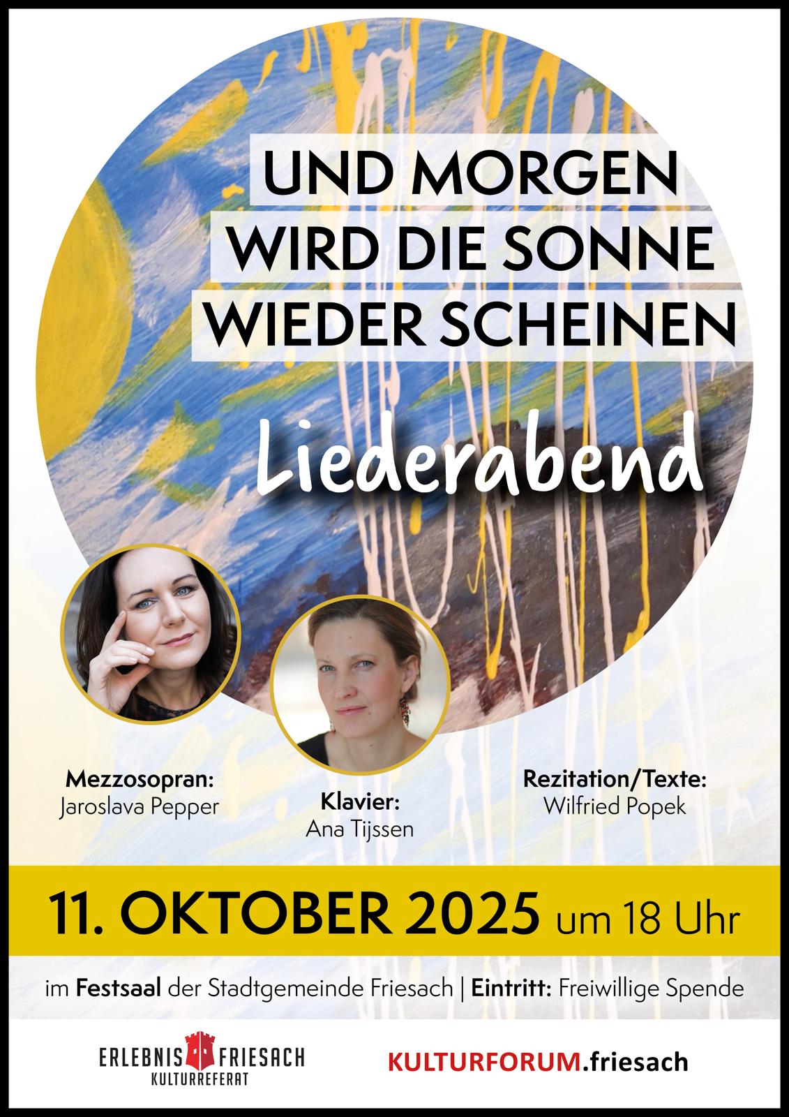 Ich freue mich über die Möglichkeit einen Liederabend mit den bekannten und wunderschönen Liedern zum Thema Nacht, Träume, Hoffnung… in meiner ‘Wahlheimat’ Friesach zu singen. An meiner Seite und mit einer tollen musikalischen Unterstützung- am Flügel Ana Tijssen und mit ausgewählten Gedichten und Texten zum Thema- vorgetragen von Wilfried Popek.